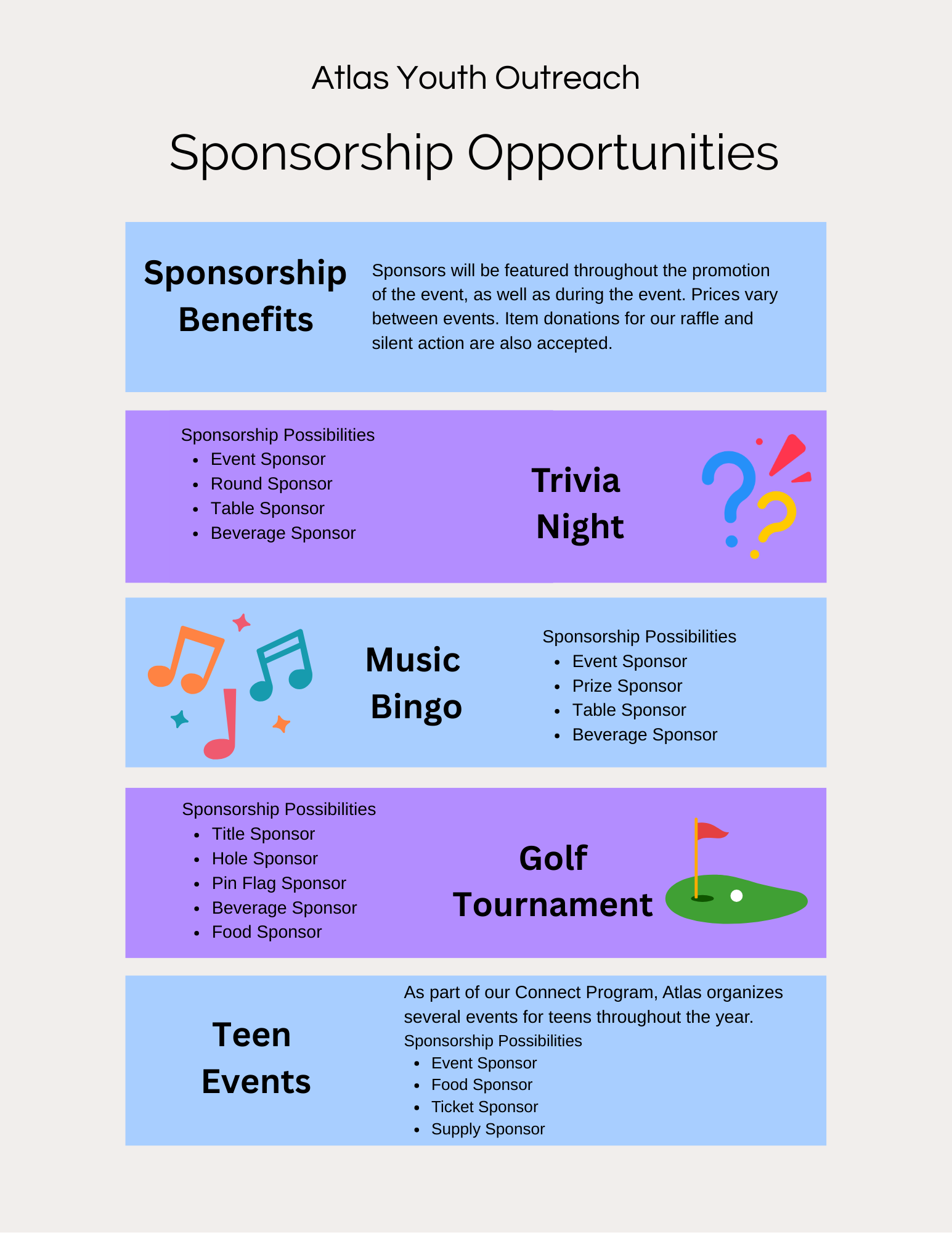 Atlas welcomes individual and company sponsors for our fundraising events. Sponsors will be featured throughout the promotion of the event, as well as during the event. Prices vary between events. Item donations for our raffle and silent action are also accepted.
