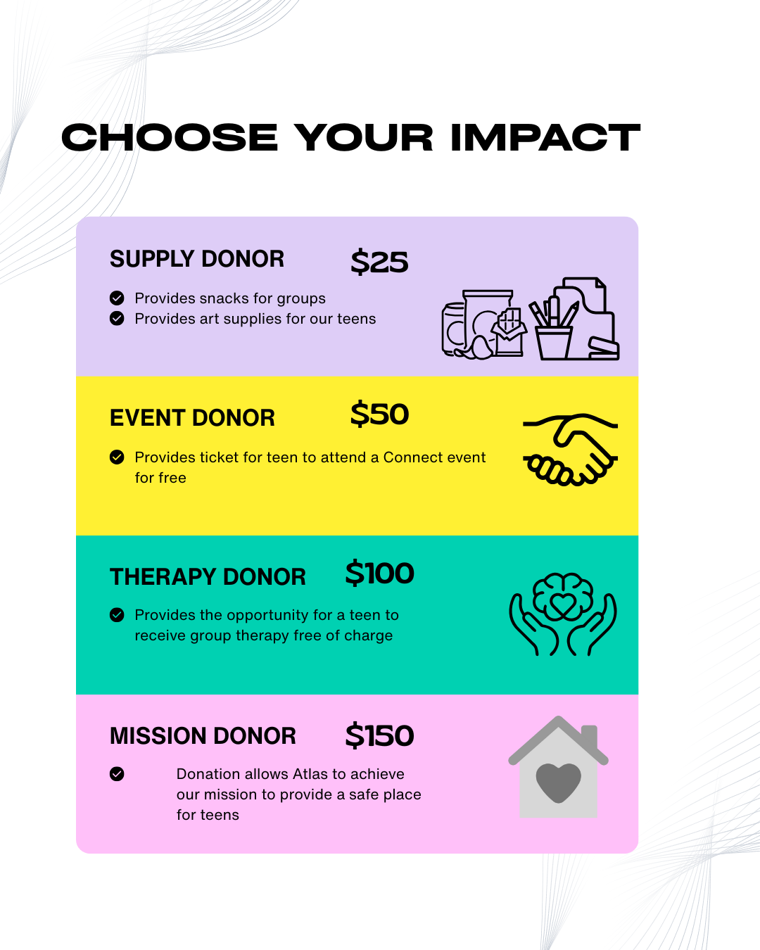 Whether it's $10 or $100, your monthly gift ensures we can continue providing teens with FREE mental health services and safe, engaging activities for them to build connects. Together, we can build a better future — one month at a time.